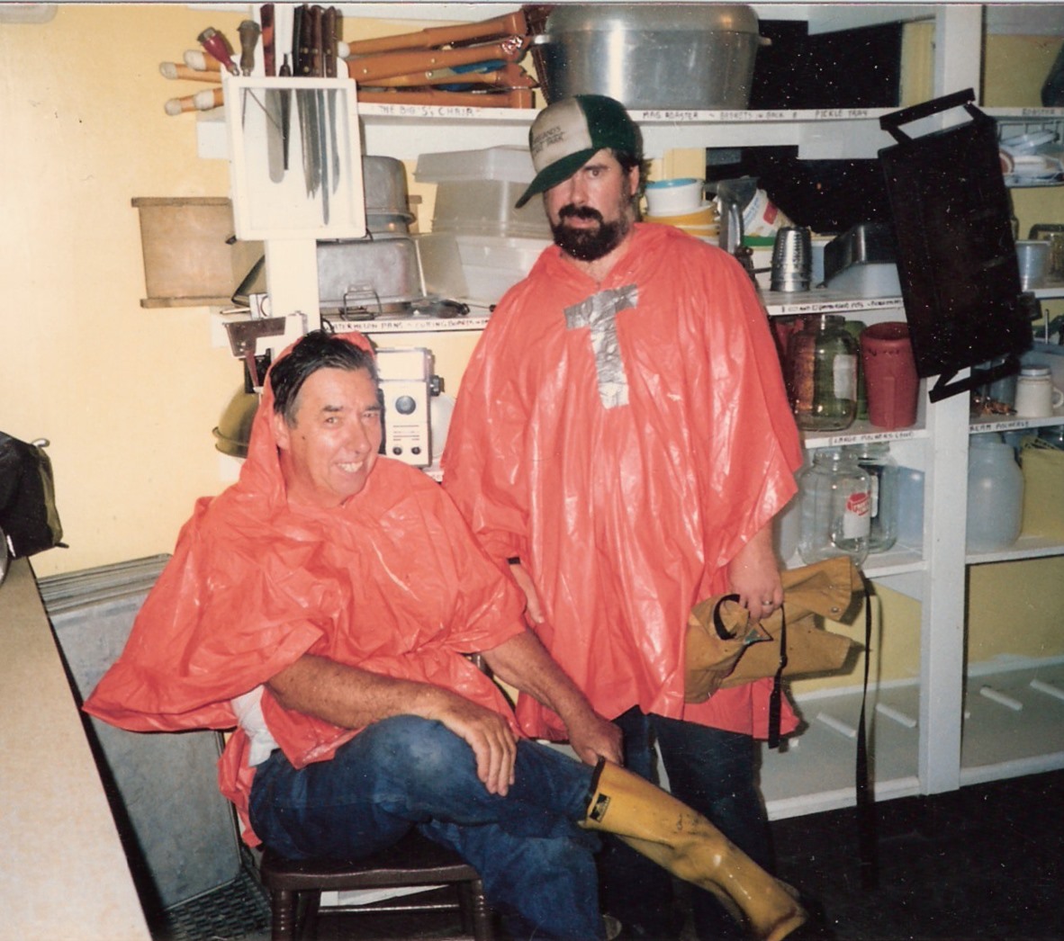 1986.. - Rob with son-in-law Bill, modelling their modern duct-tape rainwear